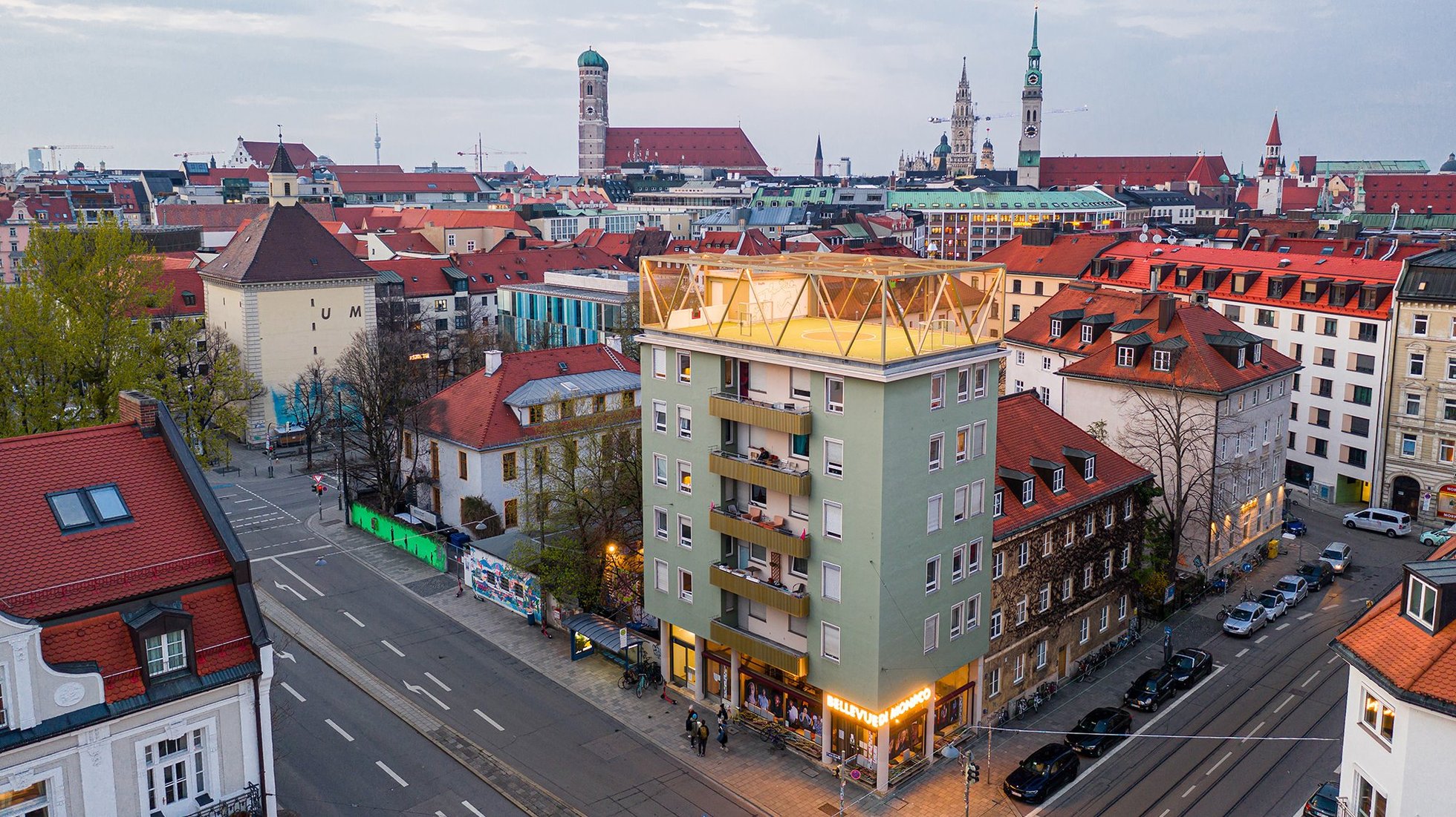 Dieser Preis überstrahlt alles und das nicht nur sprichwörtlich, weil sich auf dem sechsgeschossigem Wohnturm Bellevue di Monaco seit Ende 2020 eine grandiose Dachsportanlage befindet, die nachts hell erleuchtet auf sich aufmerksam macht. Der Leuchtturm-Effekt ist absolut berechtigt, ja man wünscht sich von Herzen und aus zahlreichen Gründen, dass dieses Projekt an vielen Orten Schule macht. Erstens, weil sich hier eine Initiative leidenschaftlich, kreativ und nicht zuletzt mit der nötigen Hartnäckigkeit dafür eingesetzt hat, dass Bestandsgebäude nicht abgerissen werden. Das war damals – leider – noch eine Pionierleistung, die nicht zuletzt gehörig Überzeugungsarbeit bei der Stadt erforderte, weil deren Verantwortliche lange Zeit für den Abriss plädierten. Zweitens, weil die Architekten hier deutlich machen, wie wenig es bei einem Umbau braucht, wenn man die Qualitäten eines Bestands erkennt und sich selbst als Architekt dem Gebäude unterordnet. Nicht das Haus muss sich hier einer neuen Nutzung anpassen, sondern es wurde die passende und sinnvolle Nutzung für alle drei Bestandsgebäude gesucht.
